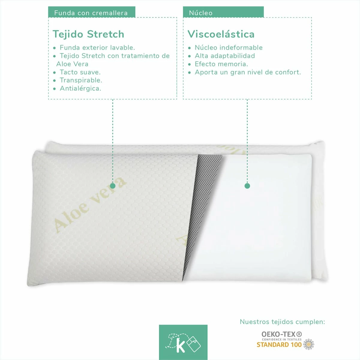 Núcleo viscoelástico adaptado. Con estructura de poro abierto para mayor transpirabilidad. Alta densidad, mantiene sus propiedades durante más tiempo. Alto confort y adaptabilidad gracias a las propiedades de la viscoelástica. Con forma adaptada para ofrecer soporte en la zona cervical y mantener una postura correcta. Confort Saludable. Con la forma que aporta soporte especial y la adaptabilidad de la viscoelástica se reducen los cambios de postura durante la noche y se mantiene siempre el cuello correctamente alineado con la columna sin ejercer presión sobre las cervicales. De esta forma, se evitan dolores musculares. Mayor confort, mejor descanso. Funda lavable. Funda Stretch Aloe Vera de suave tacto y sensación. Transpirable. El tratamiento Aloe Vera aporta suavidad natural y es delicado con la piel. Funda con cremallera. Desenfundable y lavable (ver etiqueta. Confianza. 3 años de garantía ante defectos de fabricación.