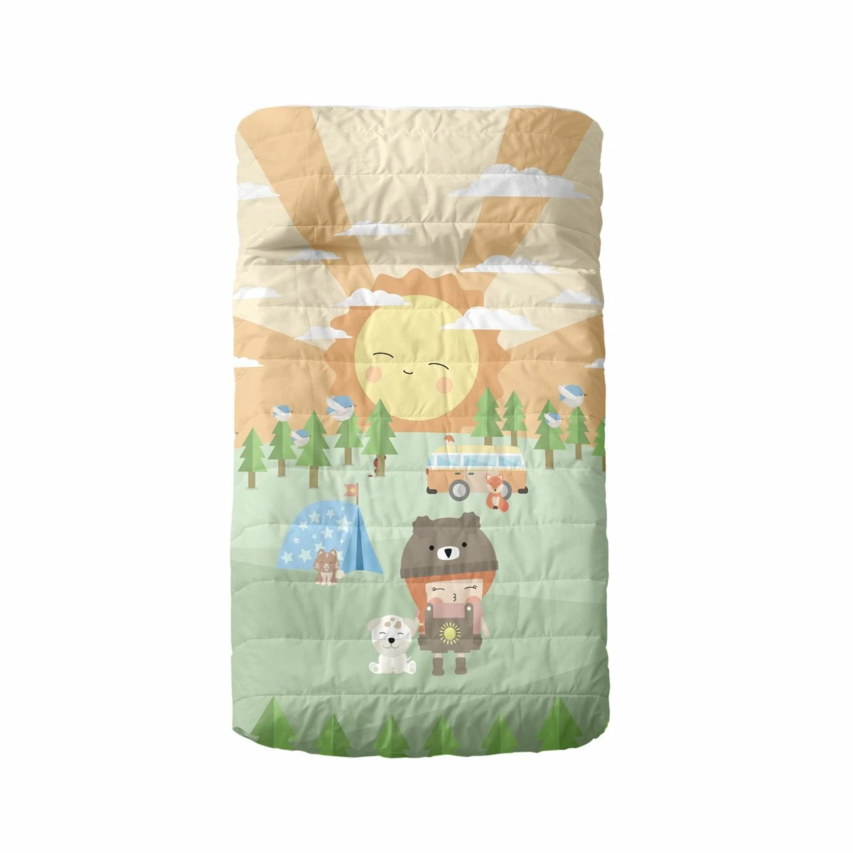 Al final de un día al aire libre, ¿qué puede ser mejor que meterse en la cama rodeado de nuevos amigos y disfrutar de la interminable puesta de sol que se encuentra en la cómoda colcha Camping de la colección Happynois? Advertencia: No te sorprendas si tu pequeño también quiere llevar su colcha a una verdadera aventura de camping!!! Tu hijo disfrutará de la comodidad y la suavidad de esta colcha de algodón 100% de 150 hilos. Perfecta para entretiempo. Incluye: – 1 x Colcha colcha 100×130 [Cuna].