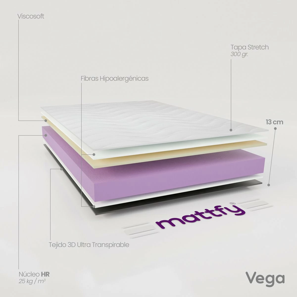 El colchón Visco Vega Reversible, combina un núcleo de espuma hr de alta densidad, gran recuperación y excelente firmeza media-alta de célula abierta, muy transpirable, que aporta la firmeza y flexibilidad adecuadas para un buen descanso y un buen apoyo de la columna; también incorpora un exclusivo acolchado compuesto por 2cm de viscosoft + fibras hipoalergénicas en ambas caras, que aportan el equilibrio perfecto para un buen descanso; La cara de verano es la de tela strech blanca, y la de verano es la de tela tipo malla 3d oscuro, incorpora tratamientos antialérgicos que nos protegen de ácaros, bacterias y hongos. Colchón ideal para camas nido, literas, camas infantiles, camas de invitados y usos ocasionales. Producto de confianza, fabricado en España, con las últimas tecnologías y certificaciones de calidad; certificados Oeko-tex y Certipur, que acreditan una fabricación sostenible y libre de sustancias nocivas. Tu bienestar y el de los tuyos es lo primero. Altura total del colchón 13cm (+/-2cm