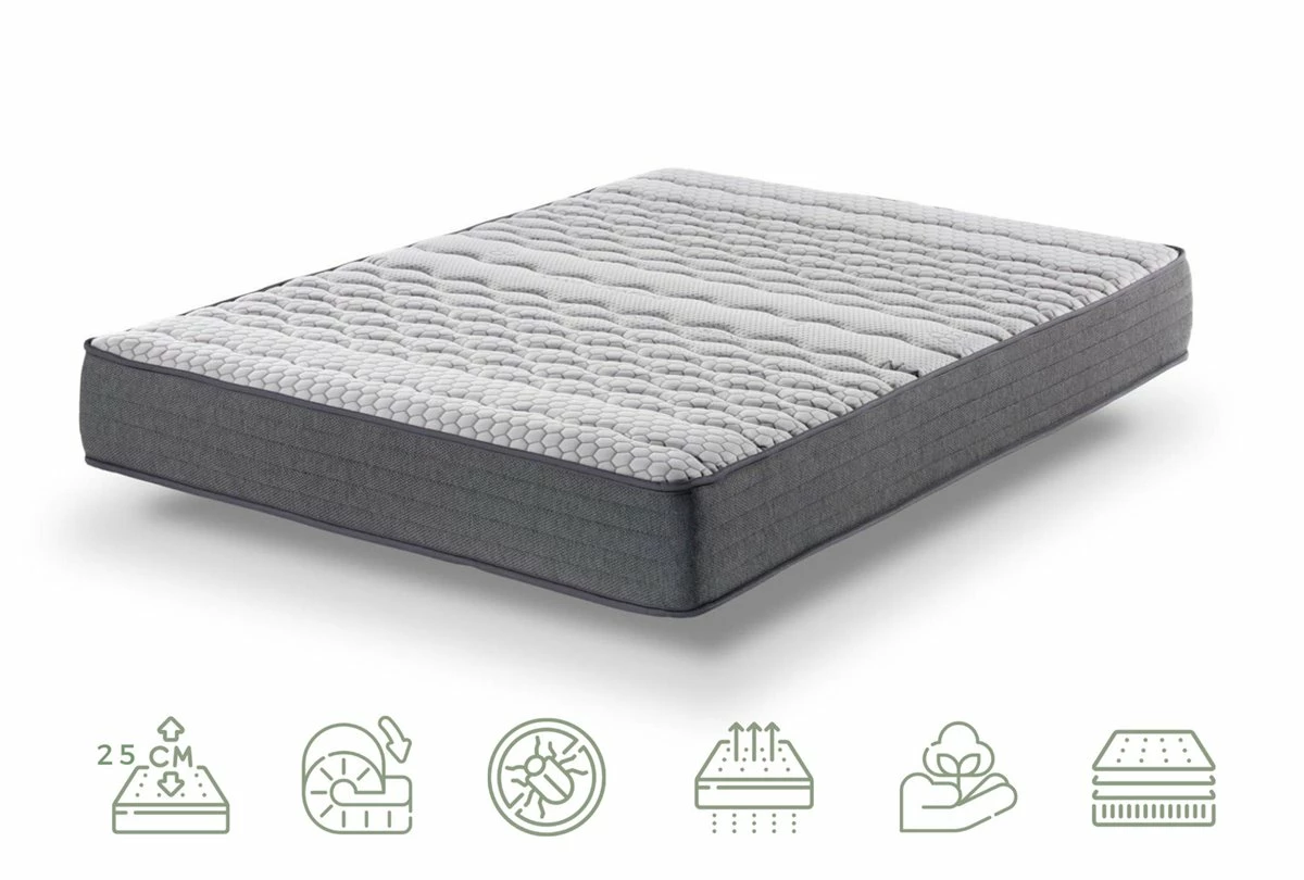 Colchón viscoelástico Fitness Sport de 3 cm de viscoelástica para lograr un tacto y adaptación más personalizados y núcleos de descanso independientes. Beneficios del colchón viscoelástico Fitness Sport: Con su tejido extensible con catalizadores para la reabsorción de energía, estimula el sistema nervioso y la circulación sanguínea.Acolchado especial terapéutico compuesto de fibras naturales. Colchón ergonómico y anatómico. Máxima independencia de lechos, minimizando los efectos de los movimientos del acompañante. Perímetro reforzado, cosido especial de seguridad para una mejor compactibilidad. Tejidos naturales con sistema Sanitized, antibacterias, antihongos, antiácaros. Características técnicas: Colchón de 27 cm de altura con 3 cm de capa de memoria de forma densidad 55kg/m3. Núcleo de espuma HR (alta resiliencia con estructura de células abiertas que facilitan su ventilación. Anti-humedad. Colchón ergonómico y anatómico. Tejido superior Stretch suave, tejido inferior 3D de máxima transpirabilidad que permite garantizar el flujo del aire en un entorno 360º. Firmeza alta y larga durabilidad. Certificado OEKO-TEX® de autenticidad de los materiales empleados en su fabricación, libres de sustancias nocivas. Producto fabricado en España. Garantía 2 años. El precio no incluye subida a planta ni montaje.