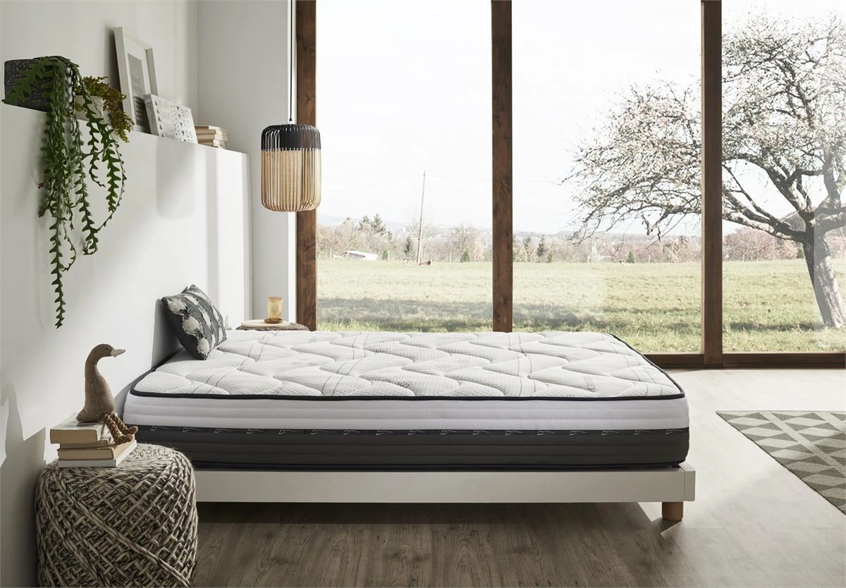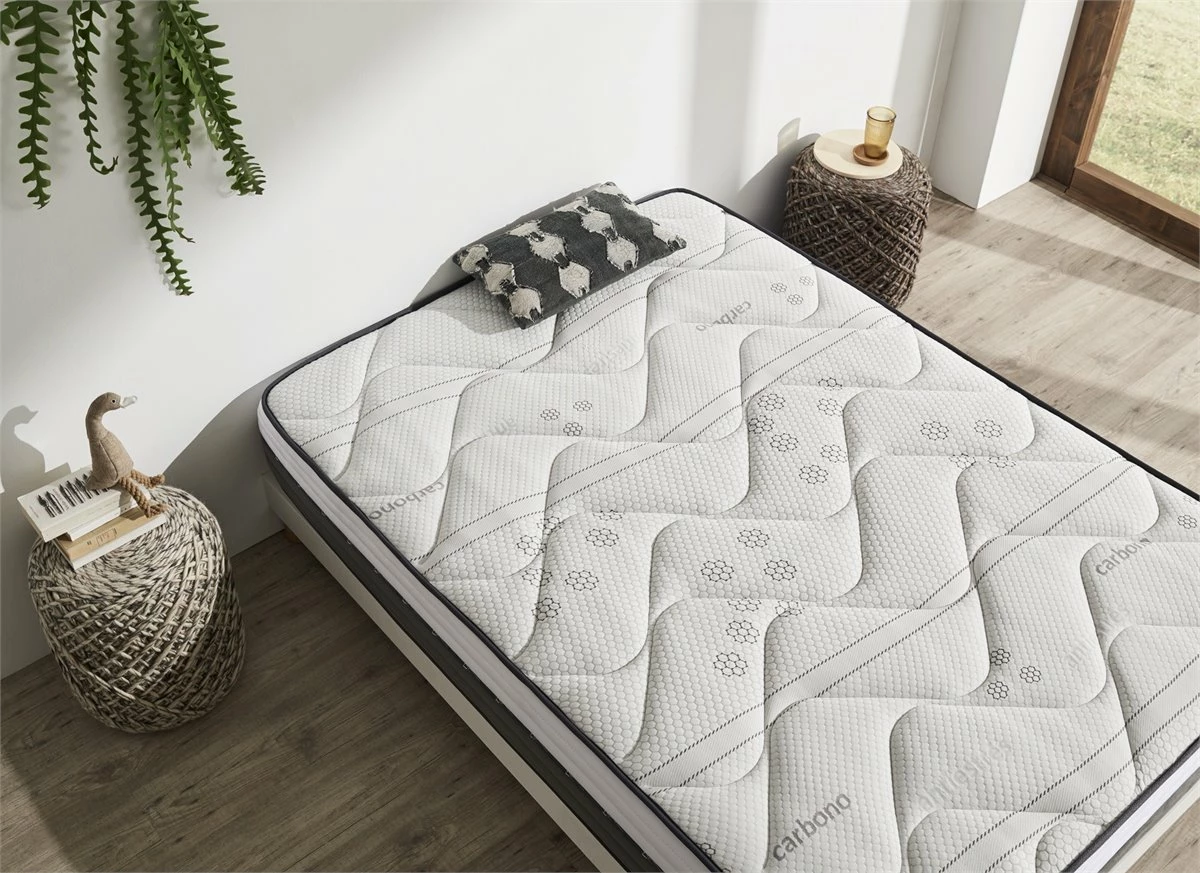 Hemos creado el Colchón Visco Látex Carbono Plus, que combina 3 elementos importantes (Viscoelástica, Carbono y Latéx para que se adapte a tu cuerpo y a tus movimientos nocturnos, ofreciéndote una sensación exclusiva de confort.La viscoelástica, es un material único que recupera rápidamente su forma, mejorando la calidad de tu descanso. Del mismo modo, alivia los puntos de presión y se adapta totalmente a tu cuerpo. Esto, combinado con el carbono, nos ofrece una transpirabilidad absoluta y una óptima temperatura eliminando el calor acumulado durante la noche. Finalmente, nuestro último elemento y el más novedoso es el Látex. Este es un material más natural que la habitual espuma de poliuretano, ya que procede del árbol del caucho y, por lo tanto, es un material más duradero, confortable y biodegradable. Características Técnicas:• Altura: 27cm +/-2.• Firmeza: Media-Alta.• Acolchado superior: 6cm de ViscoCarbono + Latéx + Supersoft.• Núcleo HR de Alta Densidad: Estructura de poro abierto, regularizando la mejor temperatura para cada estación del año. Este colchón representa la nueva generación de colchones fabricados sin muelles. • Platabanda: Tejido velour bicolor (Blanco y Marrón + microfibra, acolchado con ultrasonidos de gama alta y cinta viscoelastic en el medio.• Acolchado Cara Superior Continuo: Cada tapa se fabrica con un dibujo que emplea elaboradas formas geométricas sin espacios ni saltos entre las costuras. Mediante la unión de las diferentes capas de alta y baja resiliencia se consigue un efecto similar a la ingravidez.• Acolchado cara inferior: tejido tridimensional 3D entrelazado, fibras naturales, altamente transpirable y tacto suave.• Ribete: Cosido especial de seguridad del ribete para una mejor compactibilidad. Tratamientos y certificados de nuestros colchones: • Función higiénica Sanitized® (especialista en el tratamiento antimicrobiano de textiles que protege a los colchones contra la formación de moho y algas, reduce la presencia de ácaros y ofrece una protección duradera.• Anti-humedad: Debido a que está elaborado con un tejido de última generación, da como resultado una óptima circulación del aire. Evitando la acumulación de humedad, manteniendo el colchón ventilado, creando la temperatura perfecta mientras duermes.• Silencioso: Gracias a su estructura y composición, hace que no produzca ningún ruido durante los movimientos que hace nuestro cuerpo mientras duerme.• Independencia de lechos.• Así mismo, nuestros colchones se han creado para respetar la correcta alineación de nuestra columna mientras descansamos.• Todos los tejidos que empleamos para la fabricación de estos colchones cumplen la normativa OEKO-TEX® Standard 100 (productos libres de sustancias nocivas.Instrucciones de uso, cuidados y Garantía.• El colchón es enviado enrollado y embalado al vacío.• Es aconsejable no utilizar el Colchón hasta 10 horas después de ser desembalado.• Protégelo con una funda o protector. Aspíralo por lo menos una vez al mes. Recuerda que éste debe ir sobre una superficie uniforme y no dejar vacíos que causan deformidad.• Gíralo con frecuencia. Garantía de 2 años.Fabricado en España.