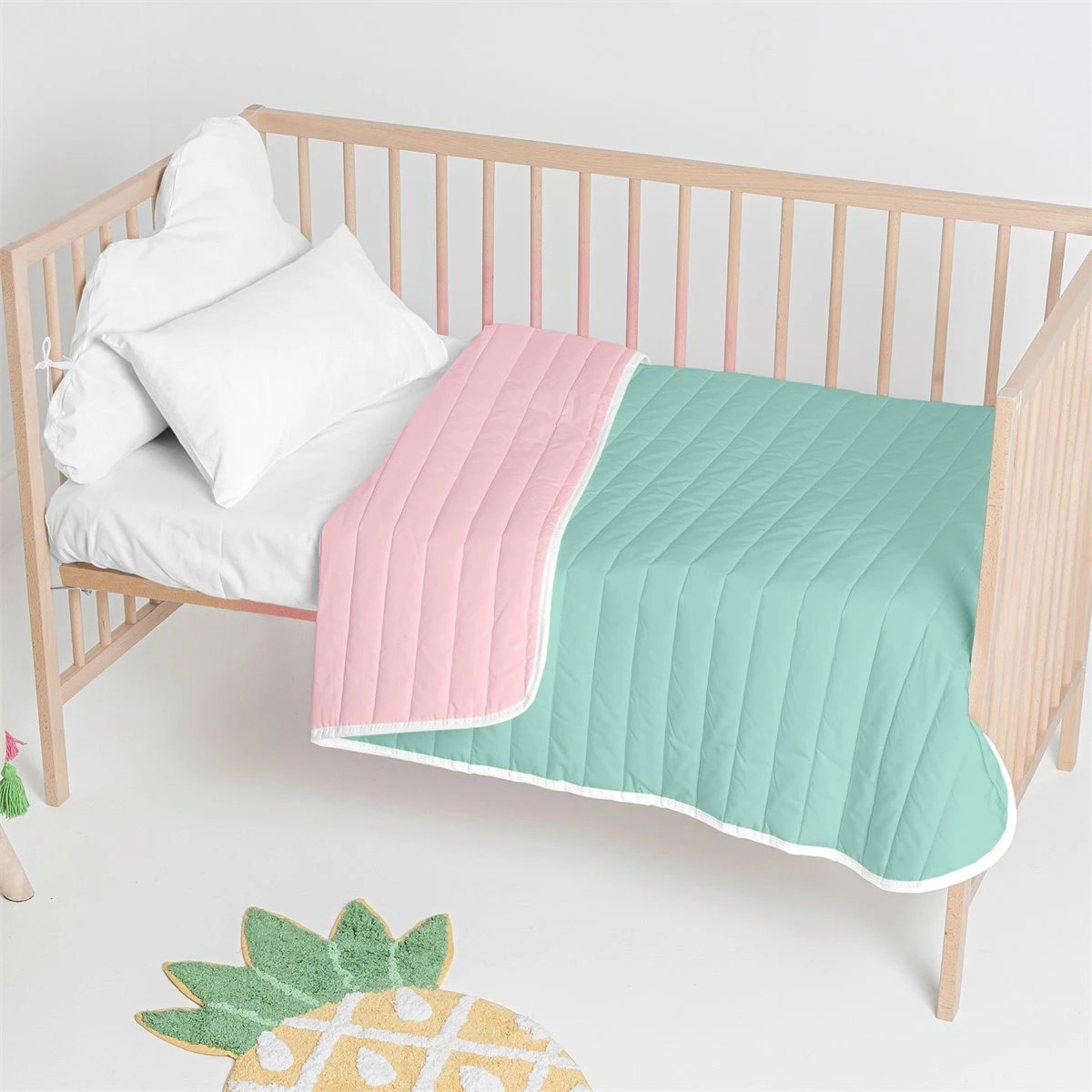 Colcha reversible de dos colores y confeccionada con un biés coordinado. Acolchado en forma de rayas. Anverso y reverso 100% Algodón con acabado suave. Ideal para entretiempo. El relleno es 100% poliéster de fibra hueca siliconada de 100 Gramos. Fabricado en España. ¡Combínalo con otros artículos de su familia! Incluye: – 1 x Colcha colcha 100×130 [Cuna].