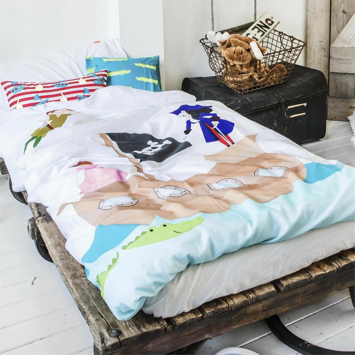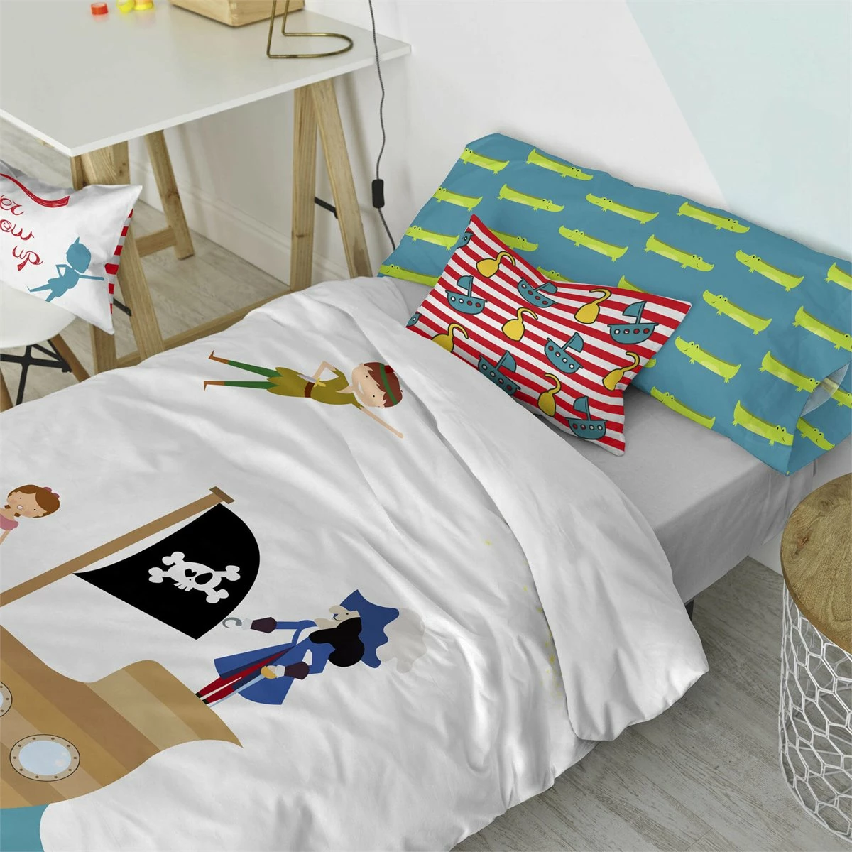 Haz que tu hijo sea el héroe de una mágica historia de eterna juventud con la funda nórdica Flying Boy de Mr Fox. Su habitación se convertirá en el escenario de muchas aventuras con hadas mágicas, cocodrilos y piratas.Esta divertida funda nórdica hecha con 100% algodón y 150 hilos le da un toque más suave y reconfortante e incluye una divertida funda de cojín llena de coloridos cocodrilos.No incluye bajeraDisponible en las siguientes tallas: * 140×200 (incluye funda de cojín estampado 63×63. * 155×220 [ Cama 80/90 ] (incluye funda de almohada estampada 45×110. * 180×220 [ Cama 105 ] (incluye funda de almohada estampada 45×125.