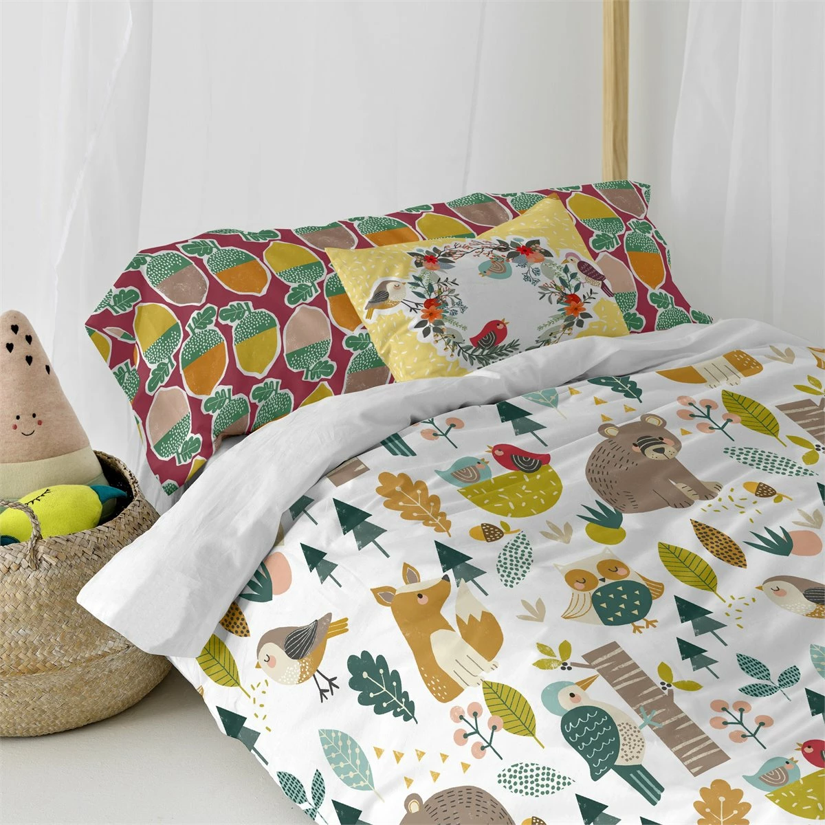 A pesar de que el otoño, con sus tonos tierra, ha llegado a la funda nórdica Harvestwood de la colección Mosh Moshi, los simpáticos animales del bosque siguen activos y alegres, almacenando todas sus bellotas para el invierno en la funda de almohada a juego.Este producto cómodo, suave y duradero está hecho en España con 100% algodón y 150 hilos. Los prácticos poppers de plástico facilitan el cambio el día de su lavado.No incluye bajeraDisponible en las siguientes tallas: * 140×200 (incluye funda de cojín estampado 63×63. * 155×220 [ Cama 80/90 ] (incluye funda de almohada estampada 45×110. * 180×220 [ Cama 105 ] (incluye funda de almohada estampada 45×125.