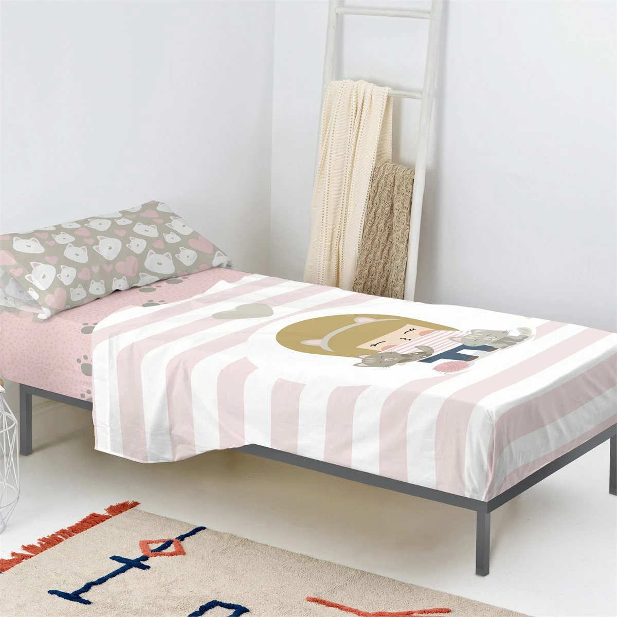 ¿Quién no querría decorar su cama con sus amigos peludos favoritos? Si tu hijo es un amante de los gatos, entonces la sábana Kitty de la colección Happynois con sus lindas ilustraciones y colores vivos alegrará su día.Esta suave y ligera sábana de algodón 100% se puede mezclar y combinar con otros productos de la misma colección, e incluye una funda de almohada estampada.Bajera no incluida.Disponible en las siguientes tallas: * 160×270 [ Cama 90 ] (incluye funda de almohada estampada 45×110. * 180×270 [ Cama 105 ] (incluye funda de almohada estampada 45×125.