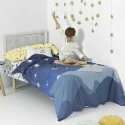 Las capas de montañas, la profundidad del cielo azul y el brillo de las estrellas doradas que se ven en la Funda Nórdica La Nuit de la Colección Le petit Prince seguro que aportan una sensación de calma y tranquilidad a la habitación de tu hijo. La combinación perfecta para una noche de sueño tranquilo.El algodón 100%, la fibra natural más utilizada en el mundo, es una gran ropa de cama: fresca, ligera, suave y transpirable. Además, se puede cambiar fácilmente el día de la colada gracias a los cierres de plástico a presión.Disponible en las siguientes tallas: * 140×200 (incluye funda de almohada 63×63. * 155×220 [Cama 80/90](incluye funda de almohada 45×110. * 180×220 [Cama 105] (incluye funda de almohada 45×125.