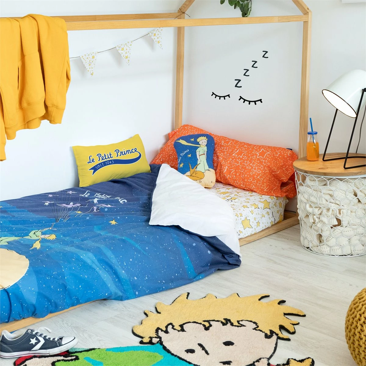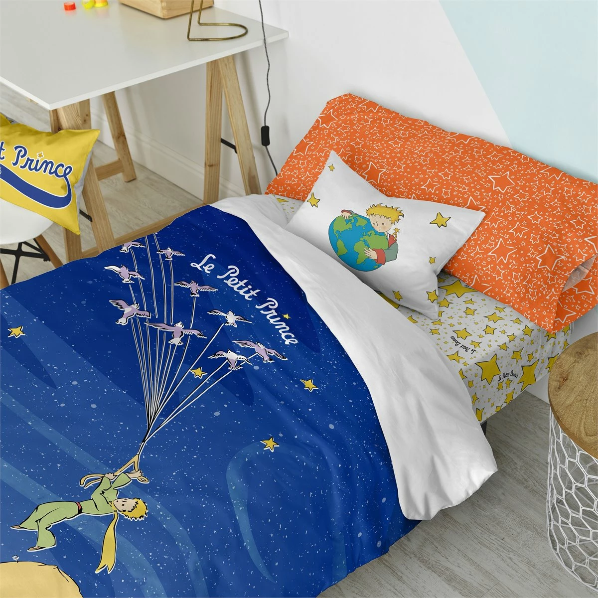Deja que la funda nórdica Migration de la colección Le Petit Prince cautive a tu hijo con su fantástica y mágica historia de un pequeño príncipe que usa el vuelo de las aves migratorias para viajar por el mundo y descubrir nuevos lugares. ¡Con un poco de imaginación, todo es posible!Este producto cómodo, suave y duradero está hecho en España con 100% algodón y 150 hilos. Los prácticos poppers de plástico facilitan el cambio el día de su lavado e incluyen una funda de cojín estrellada de color naranja.No incluye bajera ni relleno nórdicoDisponible en las siguientes tallas: * 140×200 (incluye funda de cojín estampado 63×63. * 155×220 [ Cama 80/90 ] (incluye funda de almohada estampada 45×110. * 180×220 [ Cama 105 ] (incluye funda de almohada estampada 45×125.