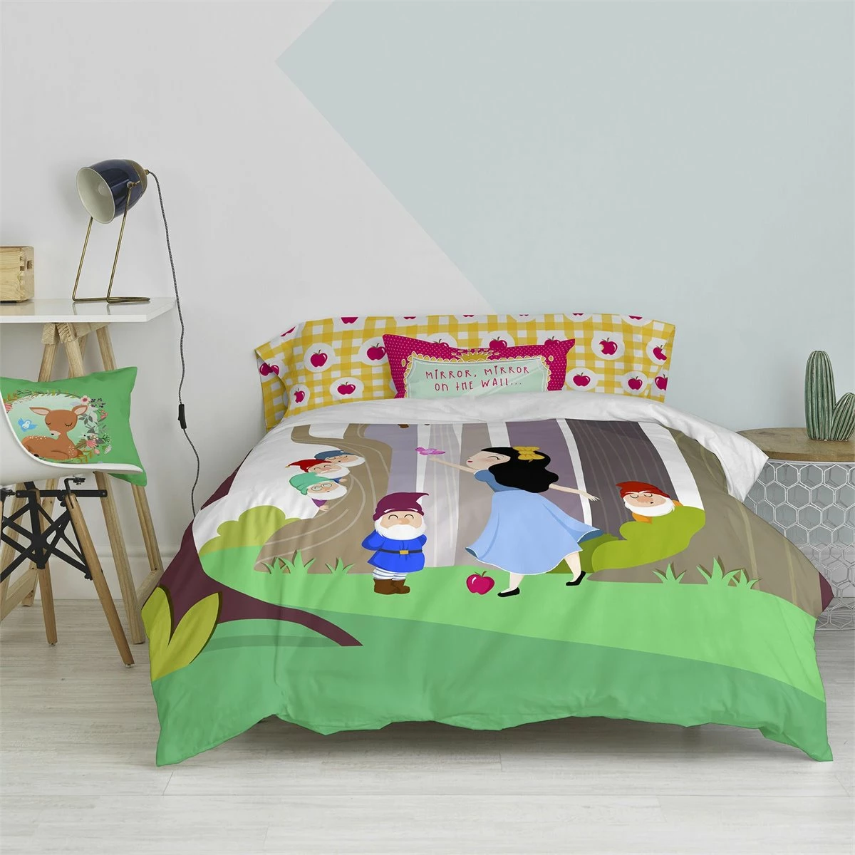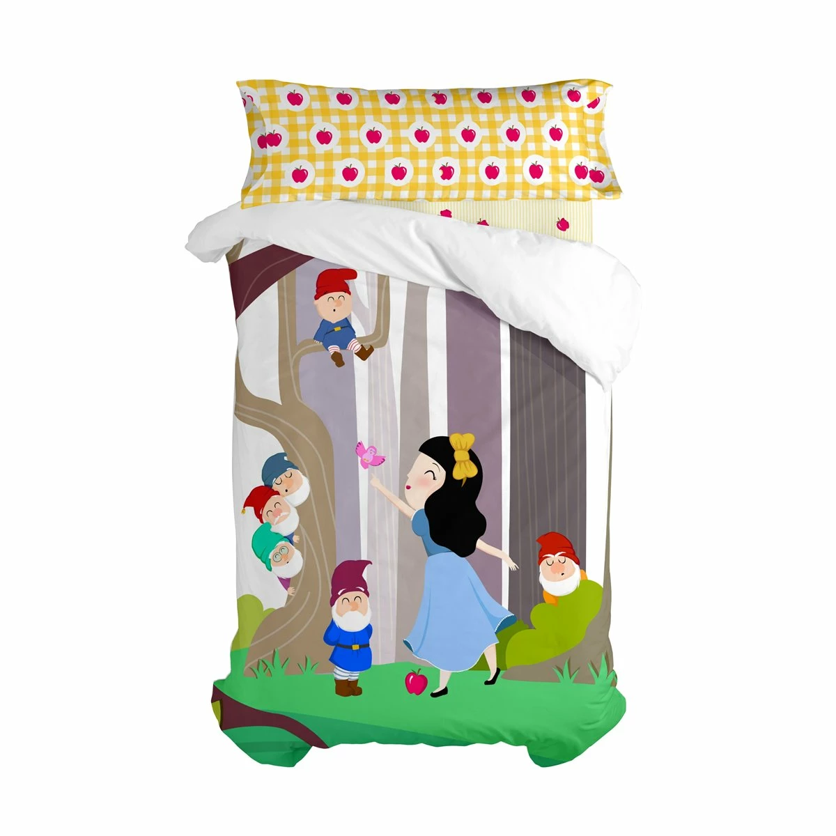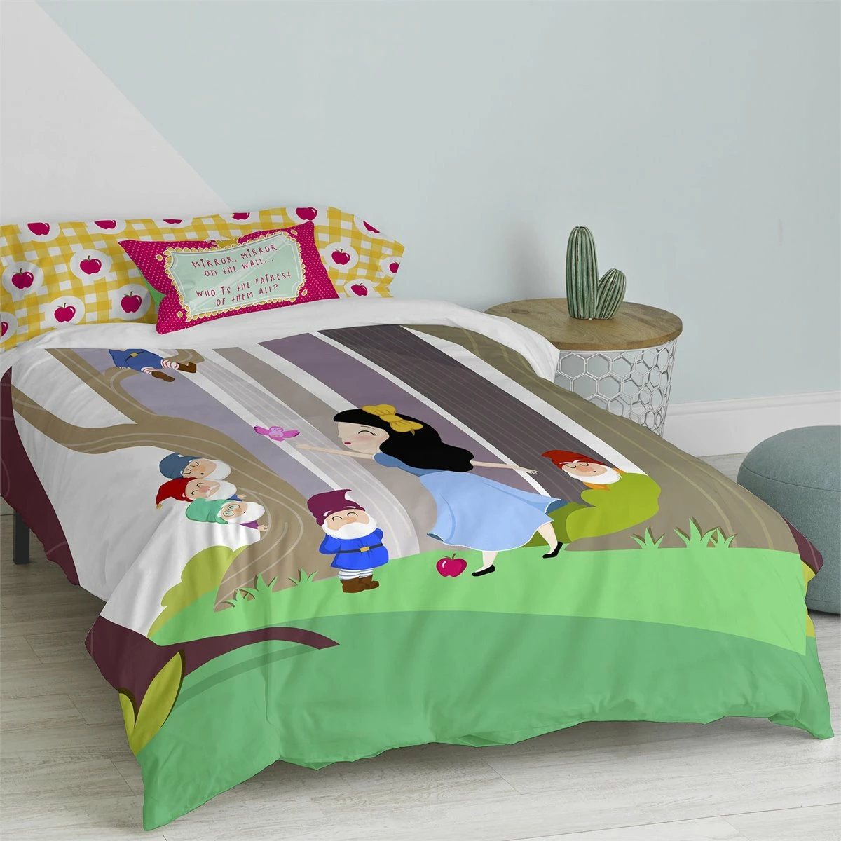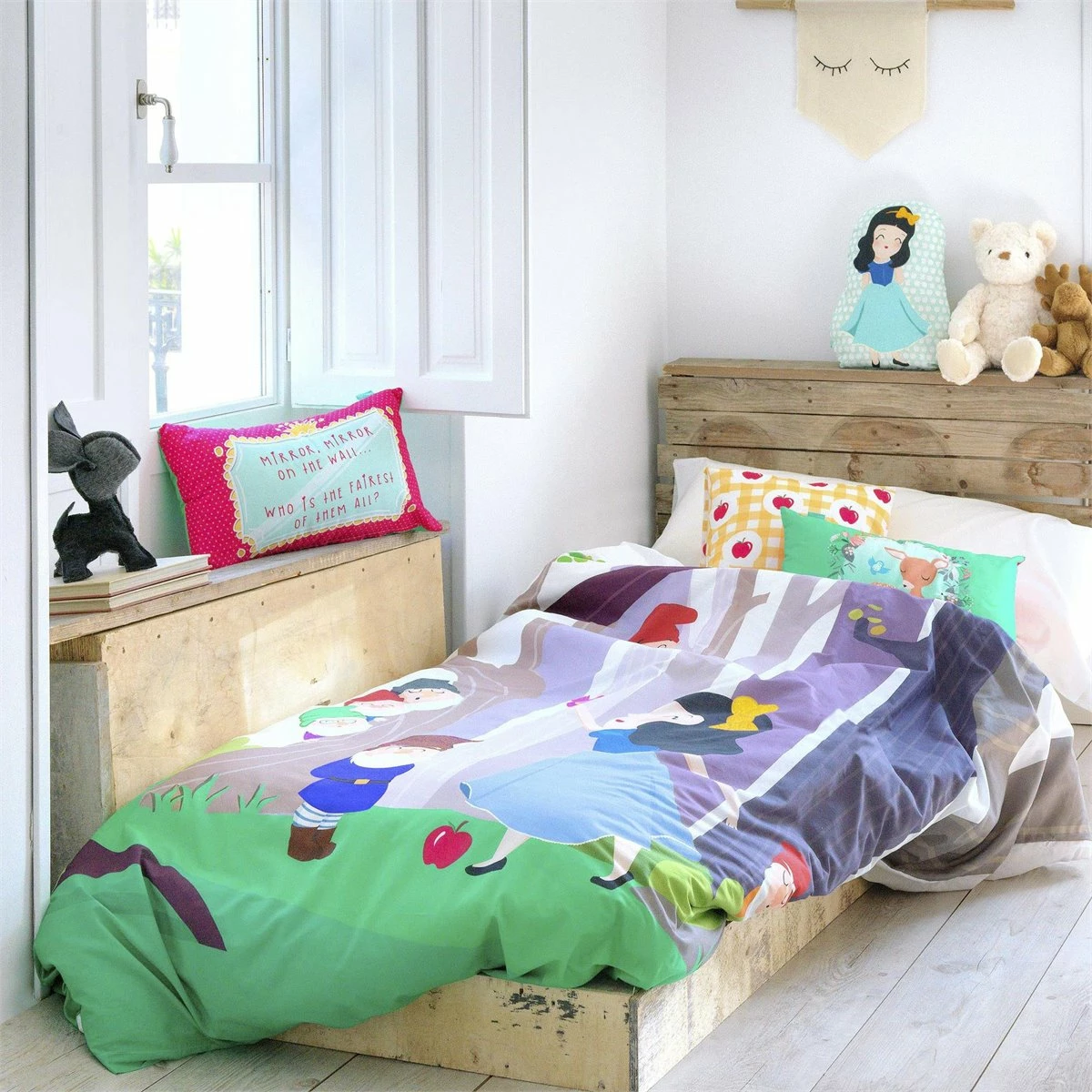 Erase una vez en una tierra muy, muy lejana …Usa la funda nórdica Mirror Mirror para contar historias encantadoras de enanos, manzanas mágicas y una hermosa niña de cabello negro. ¡Quién puede resistirse a un cuento encantador antes de dormir!Esta animada funda nórdica hecha con 100% algodón y 150 hilos le da un toque más suave y reconfortante e incluye una funda de almohada con ilustraciones de manzanas para ayudarte con tus historias.No incluye bajeraDisponible en las siguientes tallas: * 140×200 (incluye funda de cojín estampado 63×63. * 155×220 [ Cama 80/90 ] (incluye funda de almohada estampada 45×110. * 180×220 [ Cama 105 ] (incluye funda de almohada estampada 45×125.