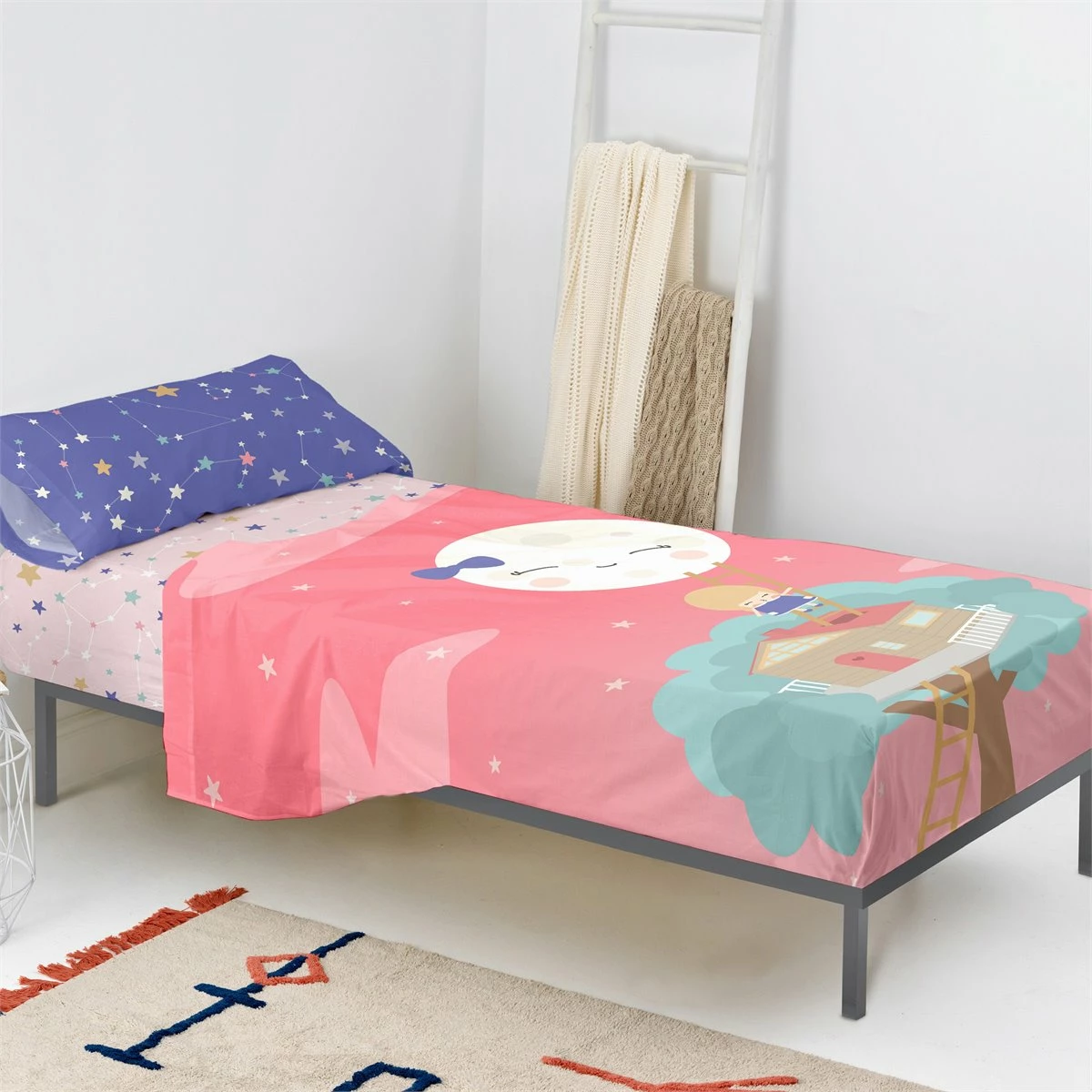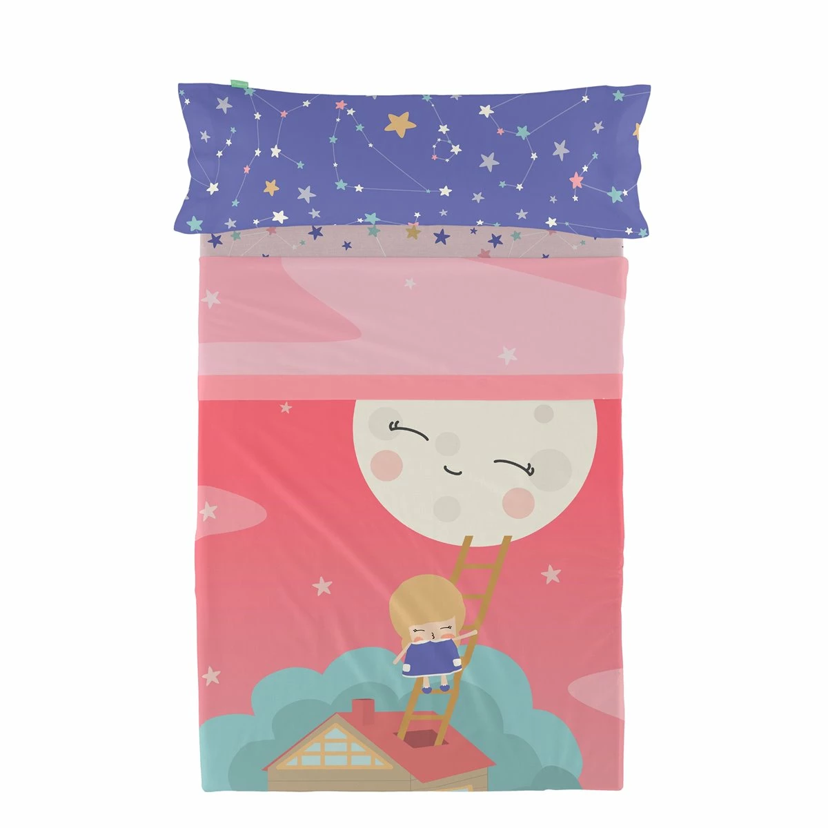 Viste la habitación de tu hijo con los tonos relajantes y las adorables ilustraciones de la sábana Moon Dream de la colección Happynois. La luna llena los vigilará todas las noches mientras brilla en un cielo rosado y brillante.Esta sábana suave y ligera de algodón 100% se puede mezclar y combinar con otros productos de la misma colección, e incluye una funda de almohada estampada.Bajera no incluida.Disponible en las siguientes tallas: * 160×270 [ Cama 90 ] (incluye funda de almohada estampada 45×110. * 180×270 [ Cama 105 ] (incluye funda de almohada estampada 45×125.