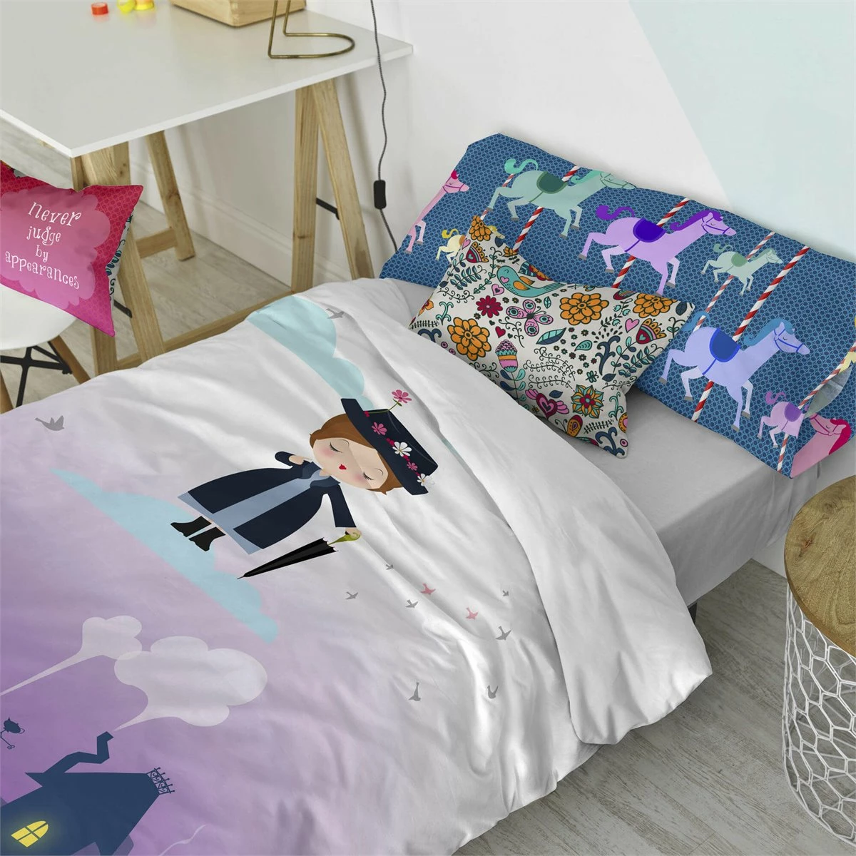 Dale un toque juguetón a la habitación de tu hijo con la funda nórdica Nanny de la colección Mr Fox. Las emocionantes historias de esta au pair inglesa y sus habilidades mágicas los harán volar en sueños encantadores y de fantasia cada noche.Esta funda nórdica hecha con 100% algodón y 150 hilos le da un toque más suave y reconfortante e incluye una funda de cojín decorativa con coloridas ilustraciones de carruseles de caballos.No incluye bajeraDisponible en las siguientes tallas: * 140×200 (incluye funda de cojín estampado 63×63. * 155×220 [ Cama 80/90 ] (incluye funda de almohada estampada 45×110. * 180×220 [ Cama 105 ] (incluye funda de almohada estampada 45×125.