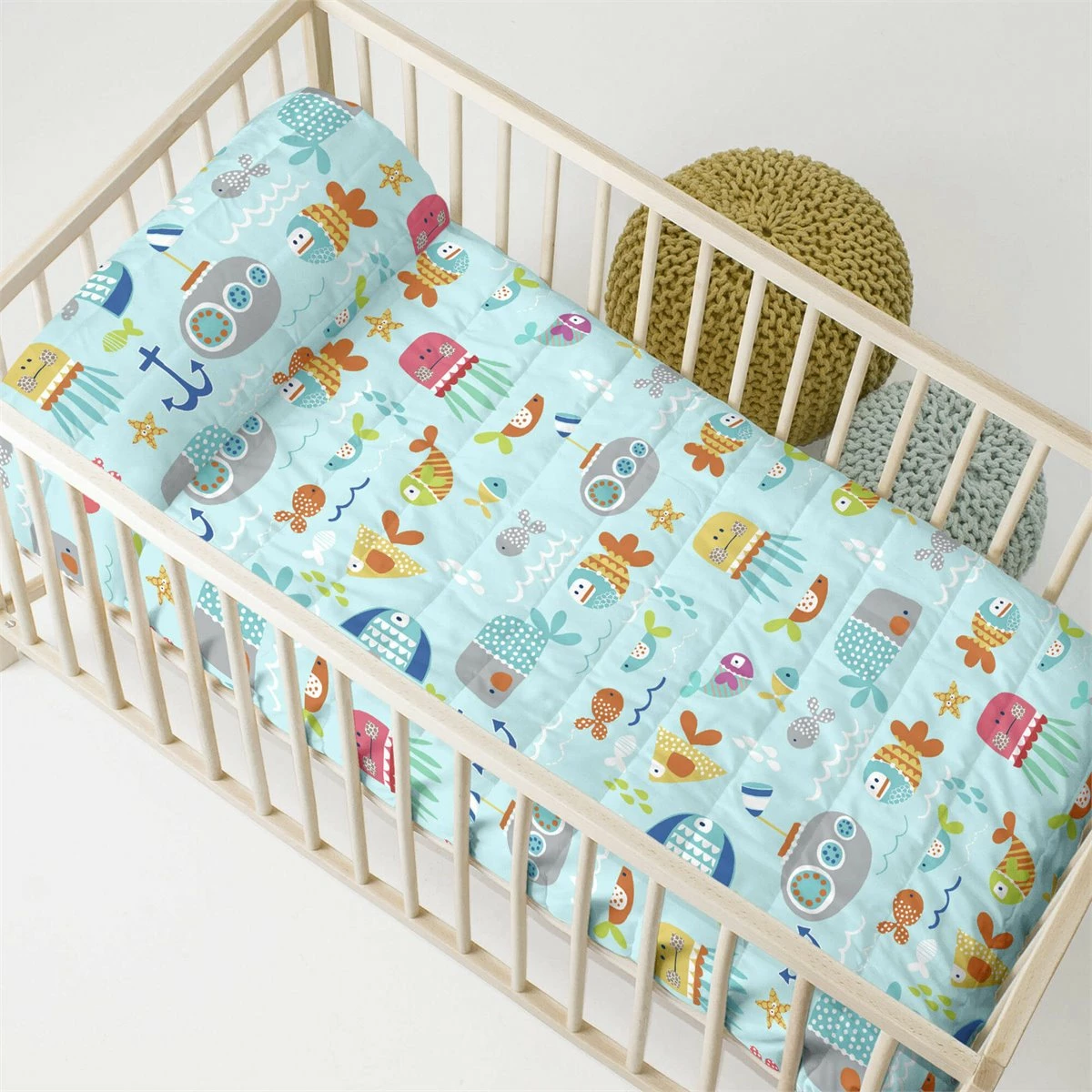 La vida marina nunca ha sido más divertida y colorida que con la colcha Sea Life de la colección Moshi Moshi. Este mundo submarino despertará la curiosidad de tu hijo y, con suerte, el interés en tener océanos más limpios. La amplia paleta de colores de este producto 100% algodón se logra gracias a la impresión digital de alta definición y al contraste con el blanco del reverso y el bies coordinado. Orgullosamente hecho en España. Acolchado en forma de rayas. El relleno es 100% poliéster de fibra hueca siliconada de 100 Gr. Incluye: – 1 x Colcha colcha 100×130 [Cuna].