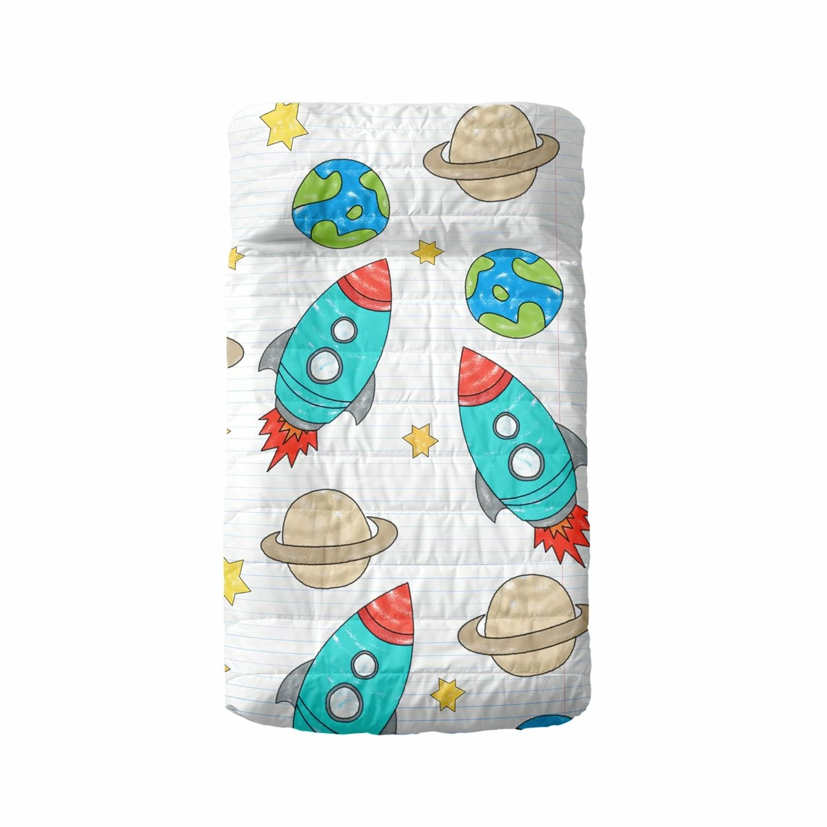 Colcha estampada con estampación digital de alta definición y acabado suave. Acolchado en forma de rayas. Anverso y reverso 100% Algodón. El reverso es liso blanco y va confeccionada con un biés coordinado. Ideal para entretiempo. Fabricado en España. ¡Combínalo con otros artículos de su familia! Incluye: – 1 x Colcha colcha 100×130 [Cuna].